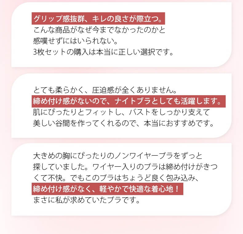 ・バストの垂れ ・バストの離れ ・脇·背中のハミ肉 ・カップの下側に入っているワイヤーが、ワキの下にあたって痛い ・ブラを外したとき、バトルを終えたかのような赤い痕が残っている |